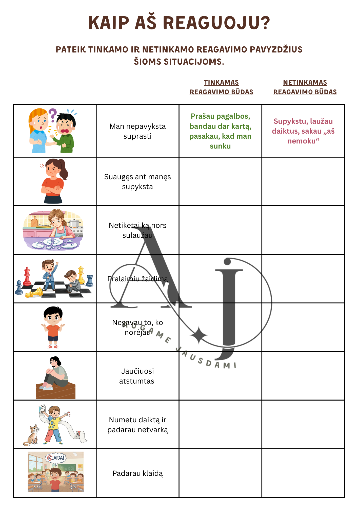 Kai susiduriame su sunkumais, svarbu ne tik tai, ką galvojame, bet ir kaip reaguojame. Šiose užduotyse mokomės pastebėti savo reakcijas ir ieškoti tinkamesnių būdų. ,,Ar gali sugalvoti tinkamą bei netinkamą reagavimo būdą?